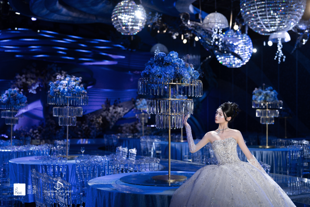 以“星海双生”为核心理念,打造了【寰宇星阶】星空厅与【潮汐回响】海洋厅。姜戈通过材质、光影与动线的精密编织,让空间本身成为情感的载体,从而达到“海天共鸣”的风格联动,演绎一场从浩瀚星辰到蔚蓝深海的沉浸式变换,象征着爱情既如星空般永恒,亦如海洋般深邃的双重特质。