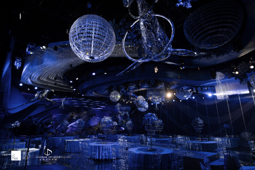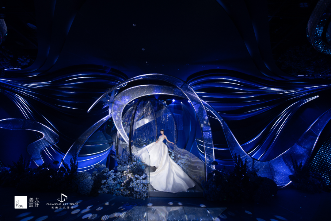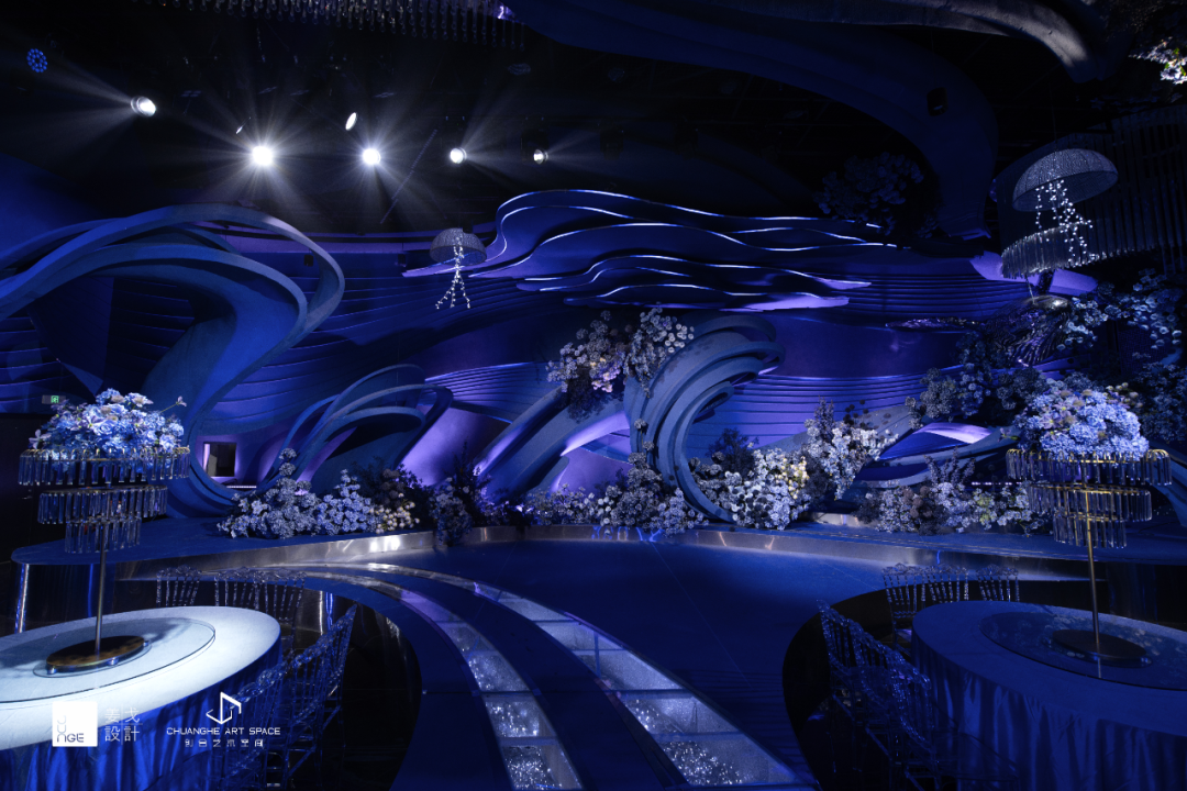 舞台是整个设计的视觉中心。玻璃楼梯盘旋而下,将整个空间联动起来,是整个设计的点睛之笔。当新人拾级而上,脚下数控星星灯明灭闪烁,垂挂的水晶链折射万千光辉,此刻,新人将携手在时间与光河中前行。