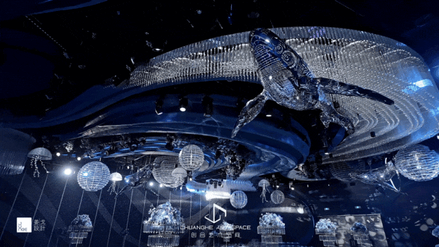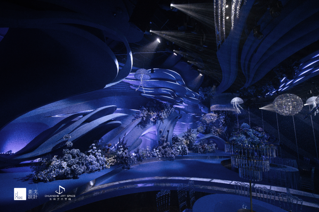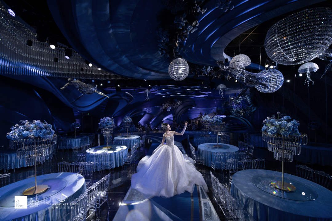 吊顶通过水晶链、蓝色泡雕与白色花艺三种不同材质的组合,分别模拟了阳光穿透海水的光柱、翻涌的泡沫与纯净的浪花,共同构成了层次丰富的“海平面之下”的画面。