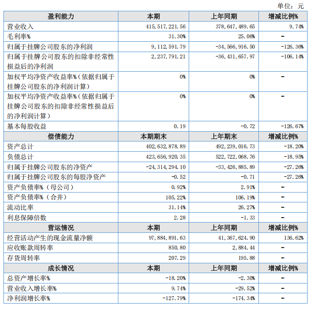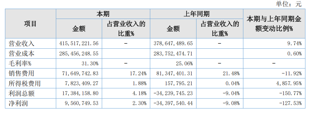 报告期内,营业收入415,517,221.56元,较上年同期增加3,686.97万元,净利润9,560,749.53元,较上年同期增加4,395.83万元。
