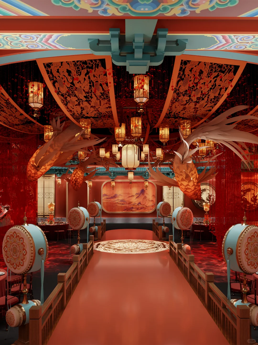 鎏金宫灯、朱红立柱、流云纹饰……仿佛置身《长安十二时辰》的浪漫场景,古典与奢华的碰撞,为你的婚礼赋予特有的仪式感!