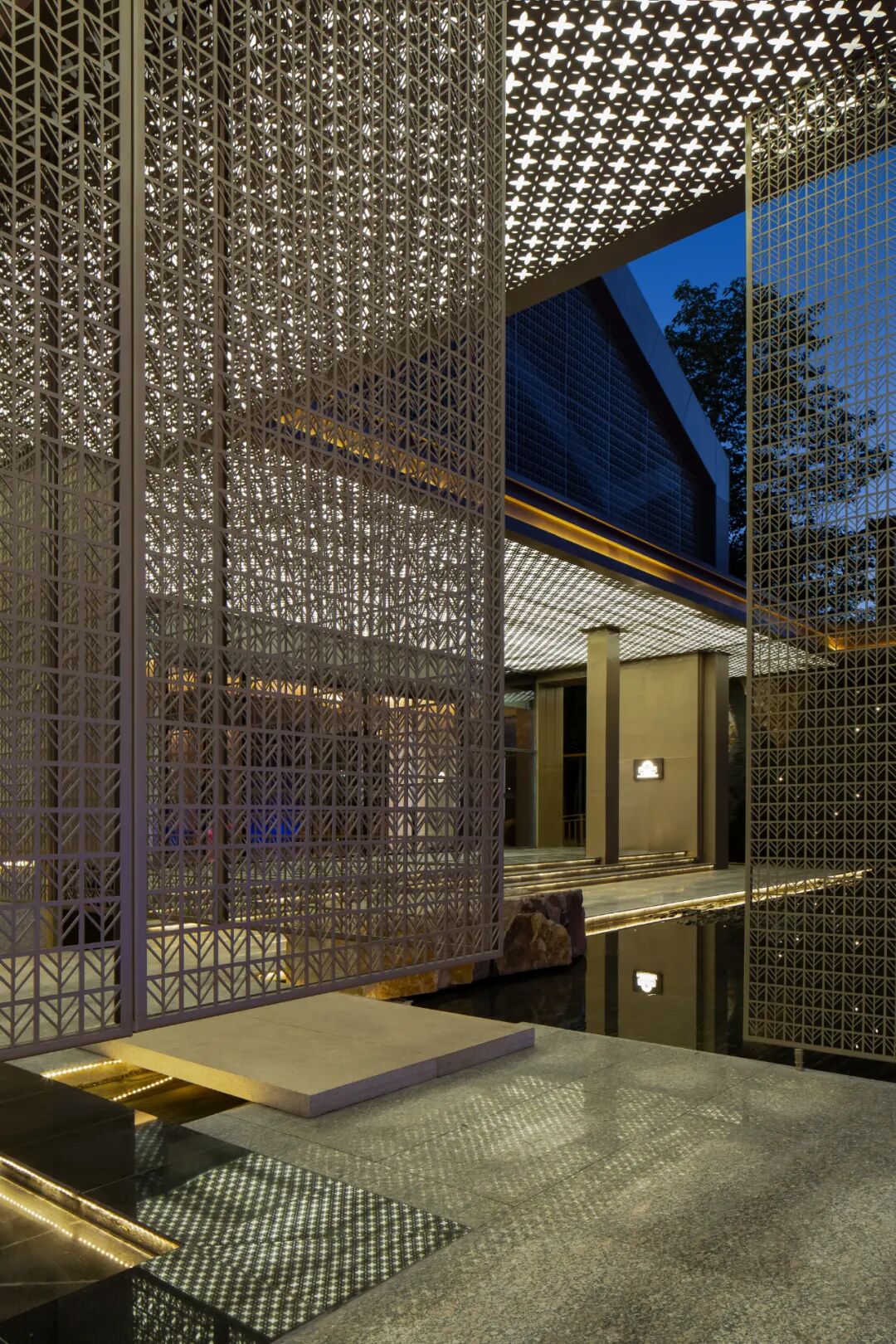 香槟金色的金属格栅从上方垂下,由古典窗花演绎而成的纹样宛如一层轻柔的帘幕包裹着中央的水景与石台,简单的几何块面延伸出空间的庄重感。而透过这隔而不断的帘幕,朦胧中可见远处的天光和影影绰绰的树木,空间的纵深在这一刻被放大到极致,丰盈的层次感给予了空间无限的意境。