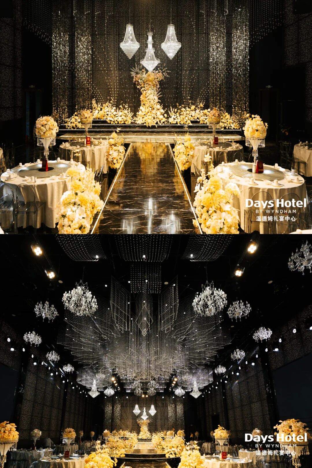 千万颗水晶吊顶搭配香槟色花球海洋,LED开合屏新娘出场,营造法式奢华婚礼。