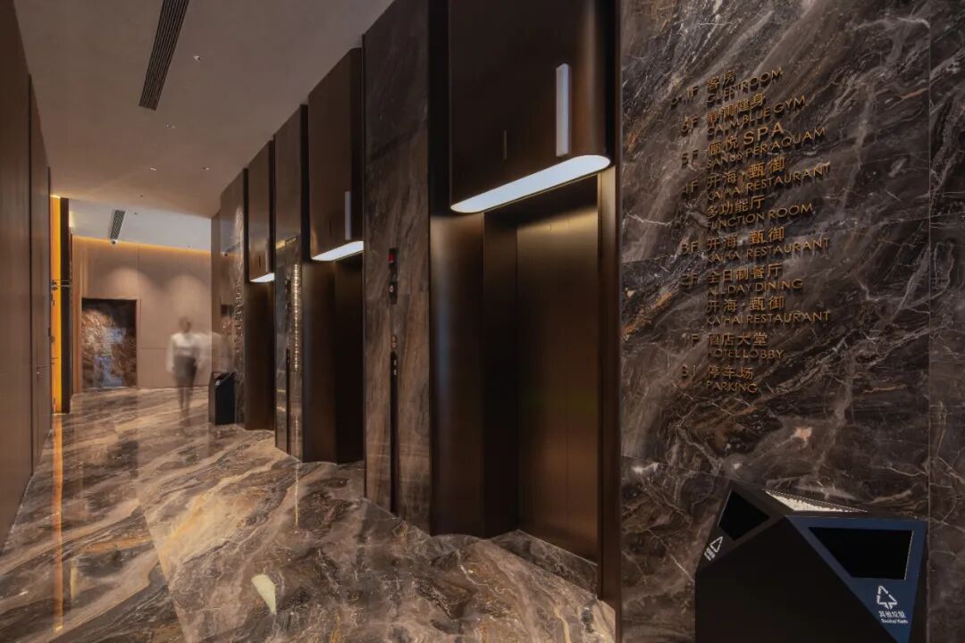 落地窗将前场的庭院景致框入室内,交织出动静皆宜的鲜活场景。地面石材的纹路为空间带来细腻丰盈的肌理,不间断地一直延伸至客梯前,为客人提供尊贵的入住体验。