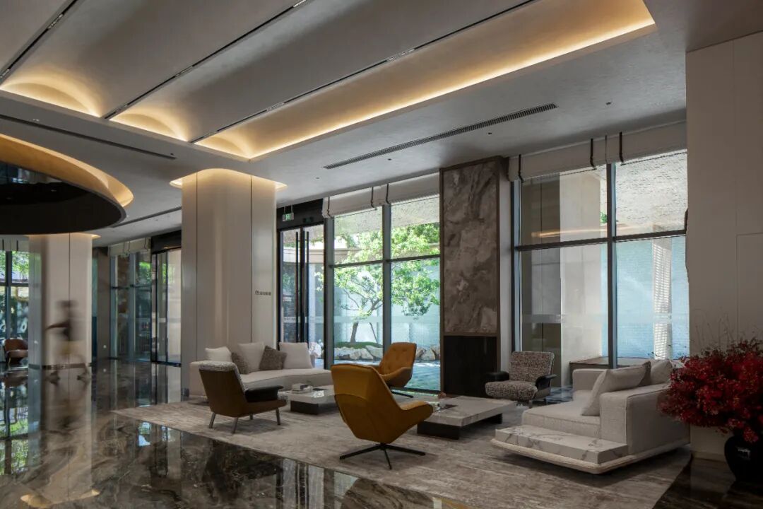 大厅里的结构柱同样采用弧形倒角的包边,灵动的弧形线条消除直线条的坚硬感,也柔化了空间氛围。大理石地面独特的纹理和光泽,呈现出精美的质感,深色木纹墙面的选用,给予空间温和而素雅的印象。