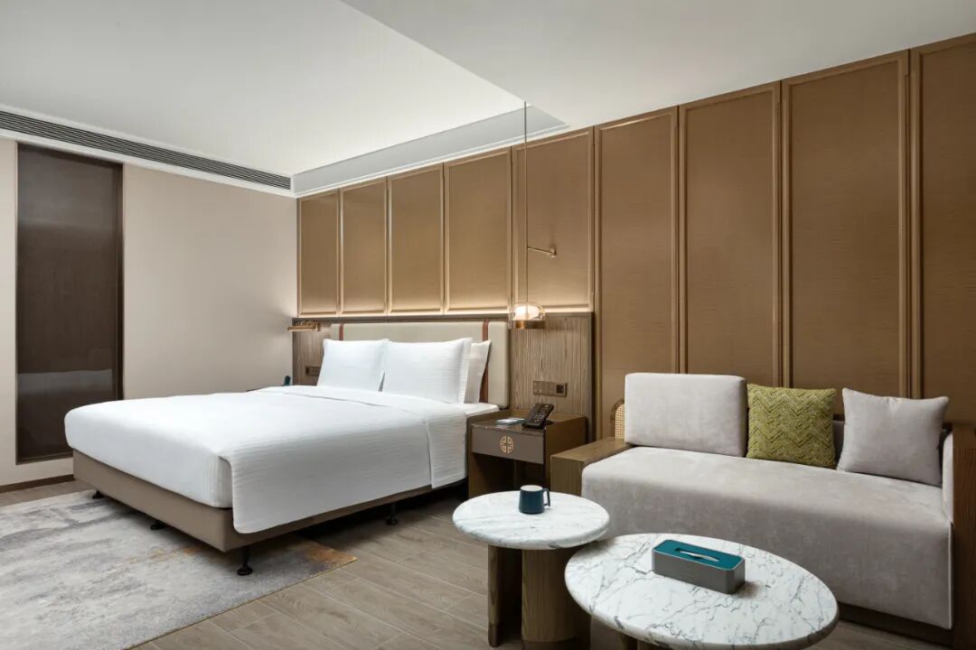 作为温德姆酒店集团旗下更具经济性的品牌,其设计哲学并不是一味地追求奢华感,而是更为重视高效的空间规划与高性价比的舒适体验,以明亮、温暖的氛围,为旅客提供亲切舒适的住宿环境。因此,设计遵循着东方美学中对光、对自然生机的细腻感知,以简练的材料运用铺陈出空间的雅致匀融。以趋同的精神追求回应酒店品牌文化,实现品牌导向与在地化美学的交融共生。