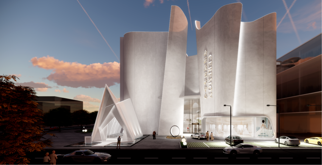 项目占地1.6万平,建筑外立面以纯白曲面构成,形似新娘曳地的裙裾,延展为一道柔和的风景线,以空间写诗,让仪式在场景中自然生长。