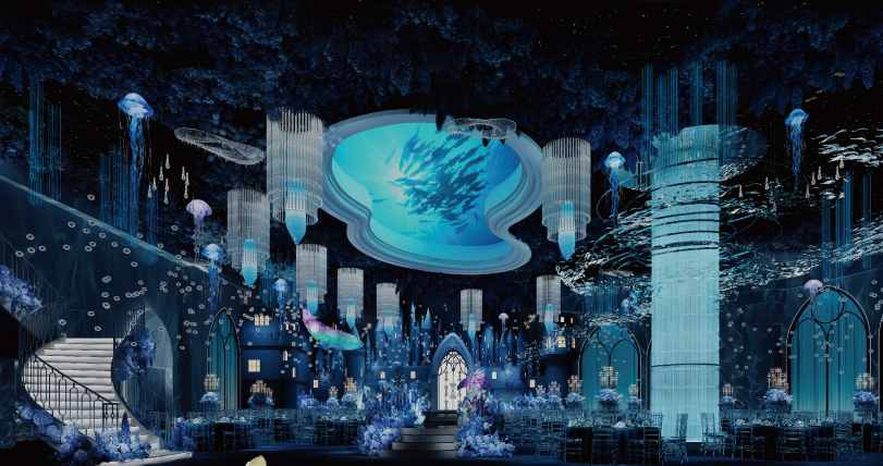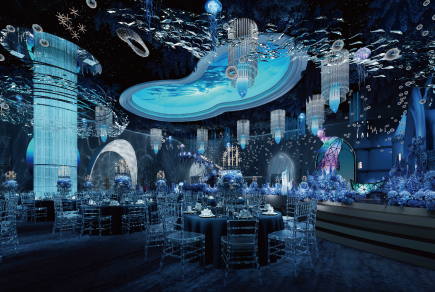 该宴会厅面积近620平,可容纳24桌宾客。以深邃的蓝色为主色调以海洋为灵感展开设计,构建出一座神秘的海底宫殿。