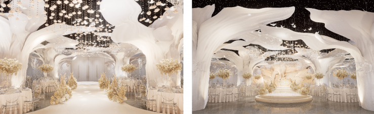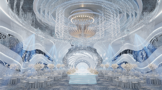 该宴会厅面积近750平,可容纳32桌宾客。以纯洁无暇的白色作为主基调,上演一场令人陶醉的梦幻视觉盛宴。