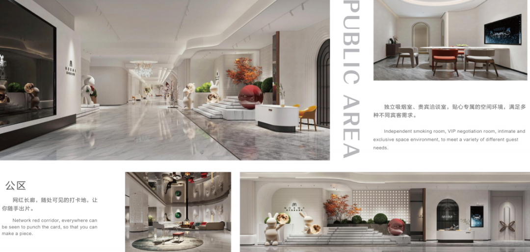 网红长廊,随处可见的打卡地,让你随手出片。独立吸烟室、贵宾洽谈室,贴心专属的空间环境,满足多种不同宾客需求。