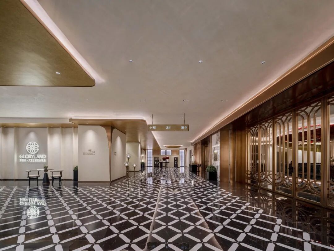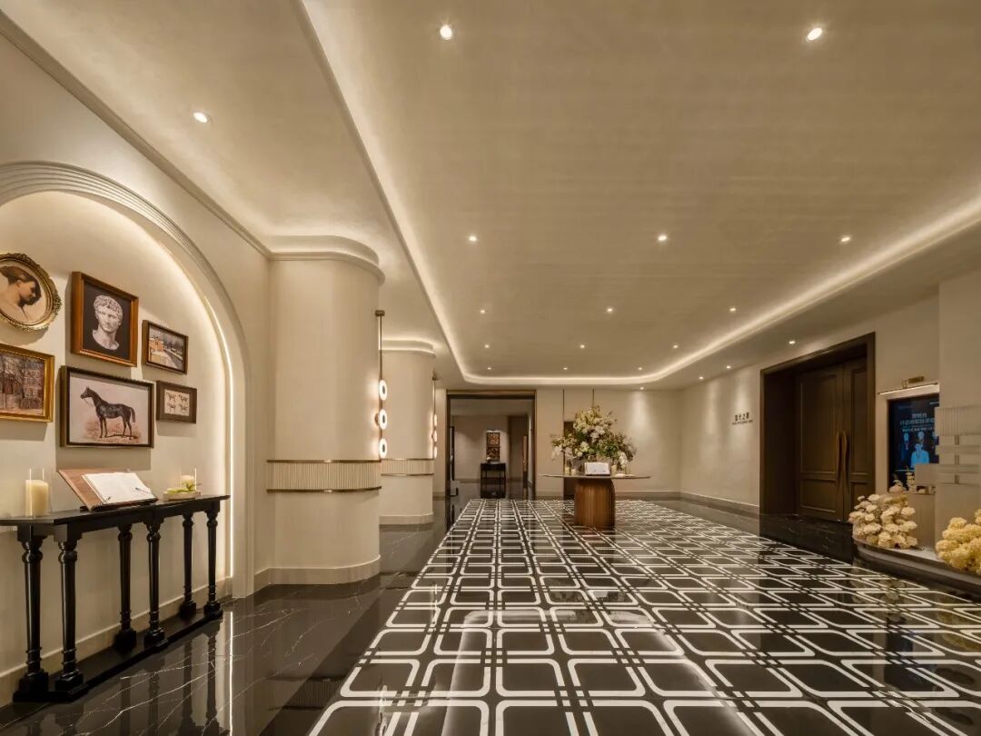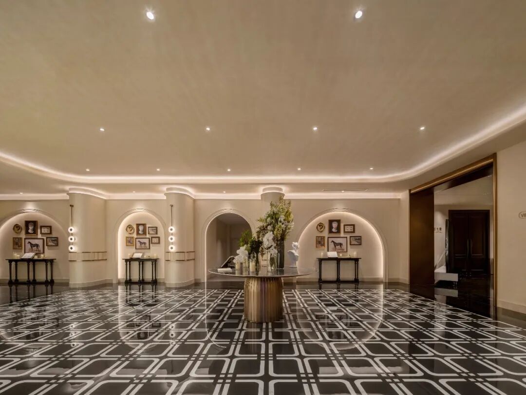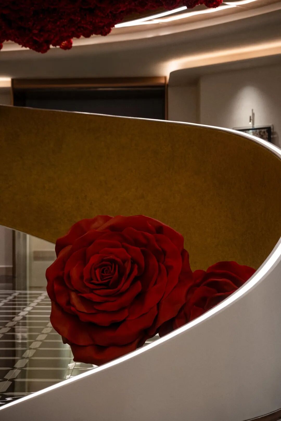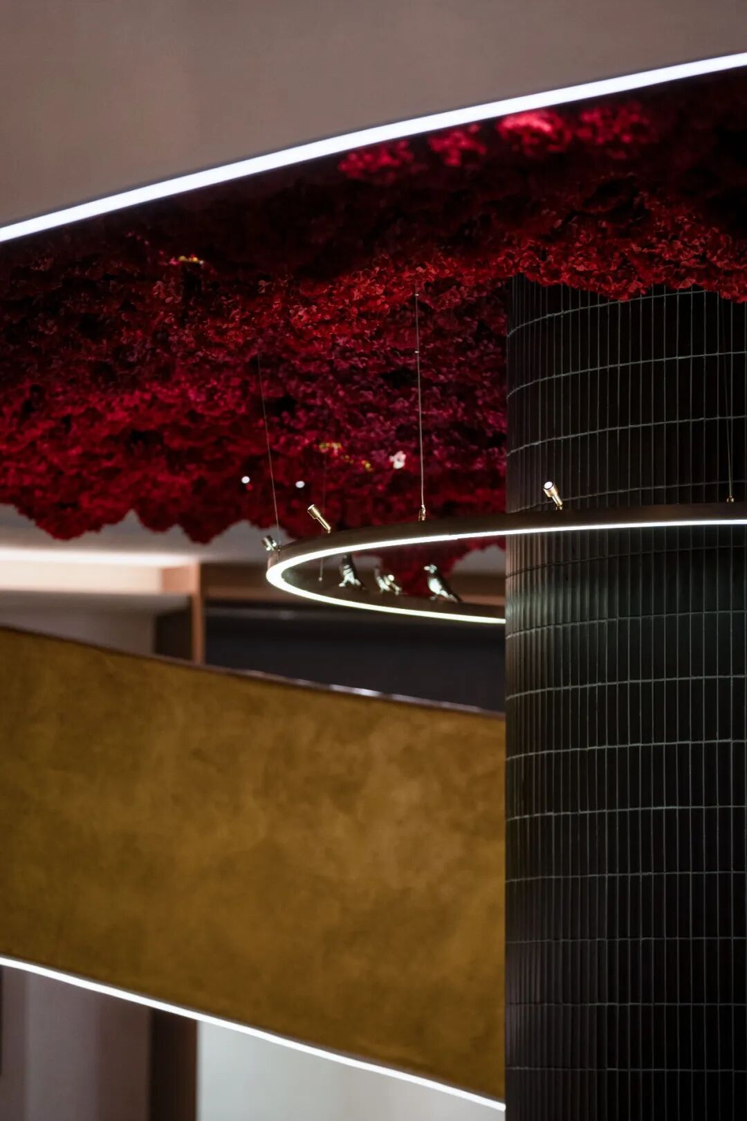 以穹顶之上流转的金色圆镜为核心,视线所及之处皆被温柔的光晕收束。纤细的镀金线条于墙面与天花间游走,宛如金箔绘制的无形旋律,在光与影的共舞中,构建出层层递进的视觉纵深。空间的主调铺陈经典的红金二色:深邃的丝绒红承载着温度的厚度,玫瑰的绯色在其间若隐若现,如一段段缄默的诗行;而鎏金则漫溢于各处细节,从穹顶的曲线、灯饰的脉络,直至地面隐约的纹样,赋予空间一种沉静的华贵。