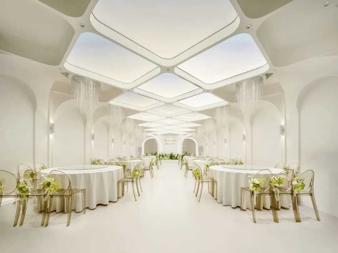 灵感源自教堂的诗篇,自上而下的光域天空,便让空间成为光的容器,是时间在头顶流淌的河。踏入一部由光主导的史诗。它温柔地包裹着盟誓的声响,也静默地承托着往后的寻常。在这里,喧嚣褪去,唯留爱意本身,在光河中静静显形,纯粹而神圣。