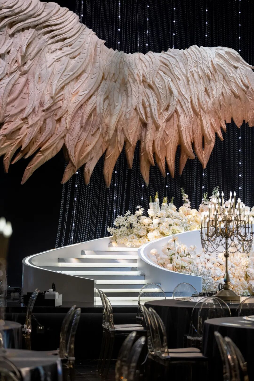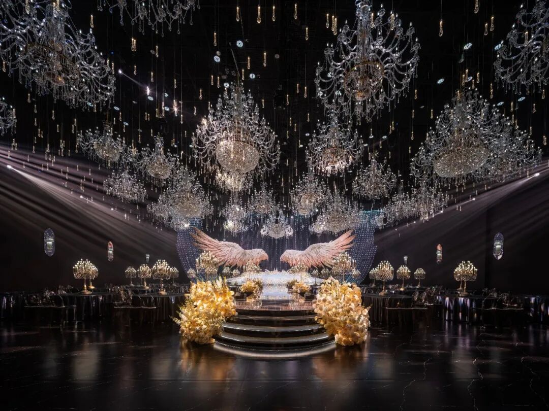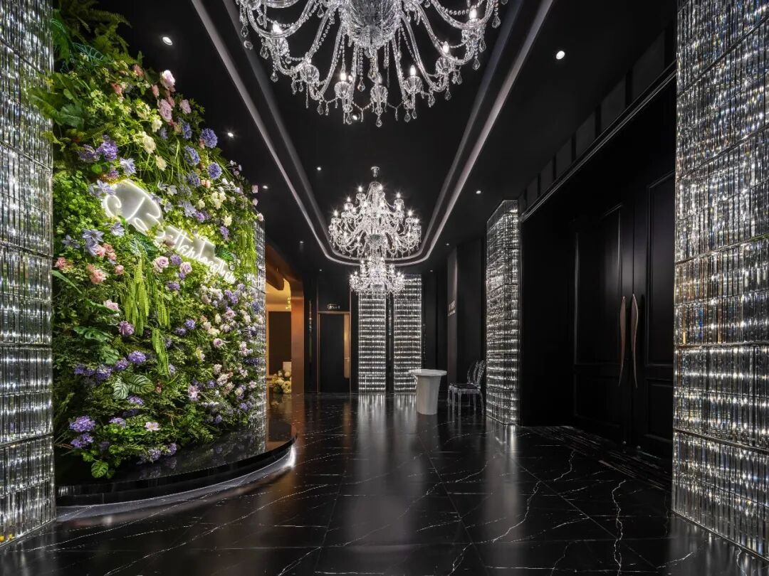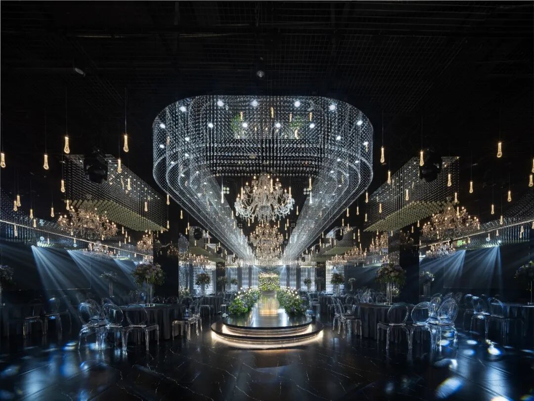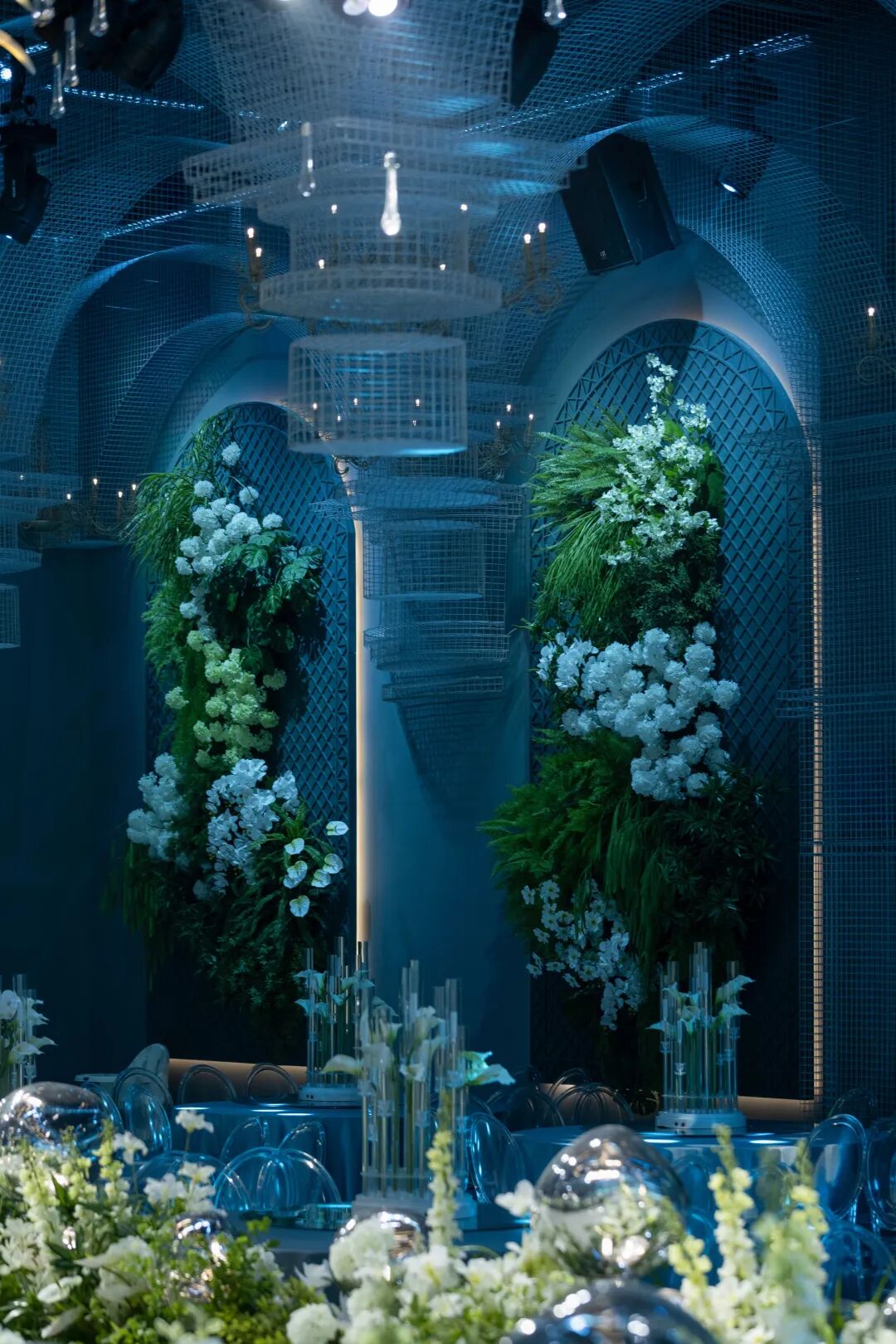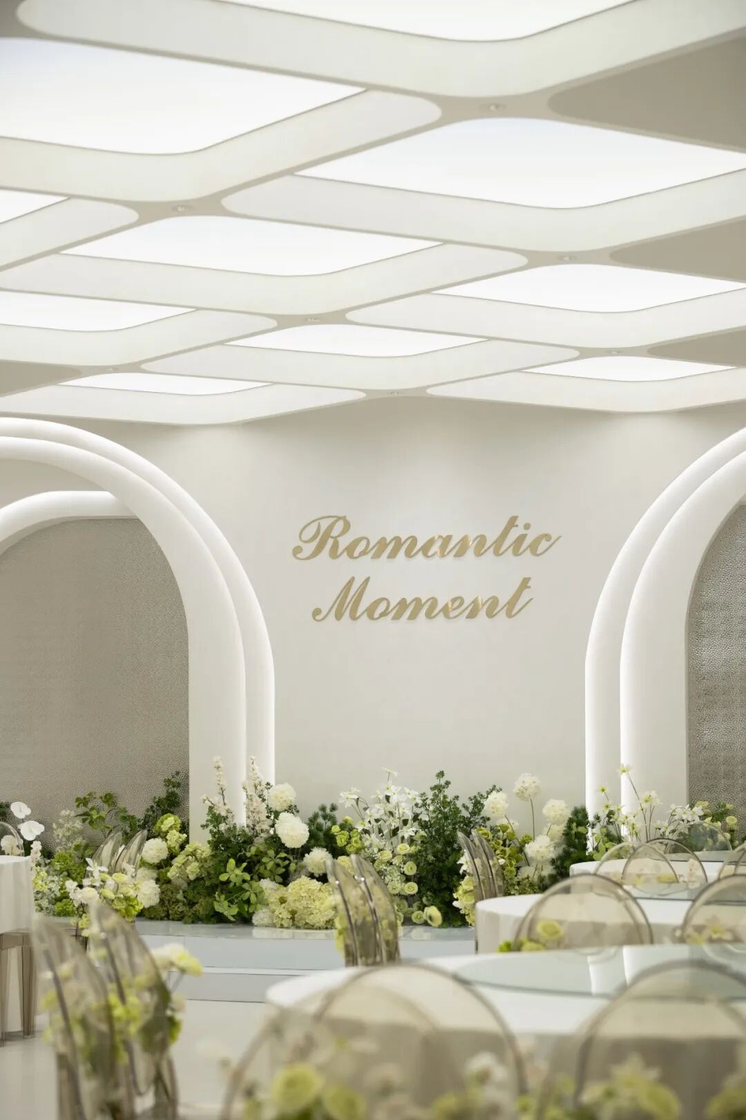 As the subtle light flickers on, it dances gracefully on the petals through the crystal prism, transforming the entire hall into the opening pages of a fairy tale. The crystal light array descends from the dome, resembling a river of stars pouring down onto the world. Dust swirls gently, and every step takes you deeper into the dreamland. In front of the vines-entwined vow wall, love grows silently, softly whispering about the eternal and fragrant promise.