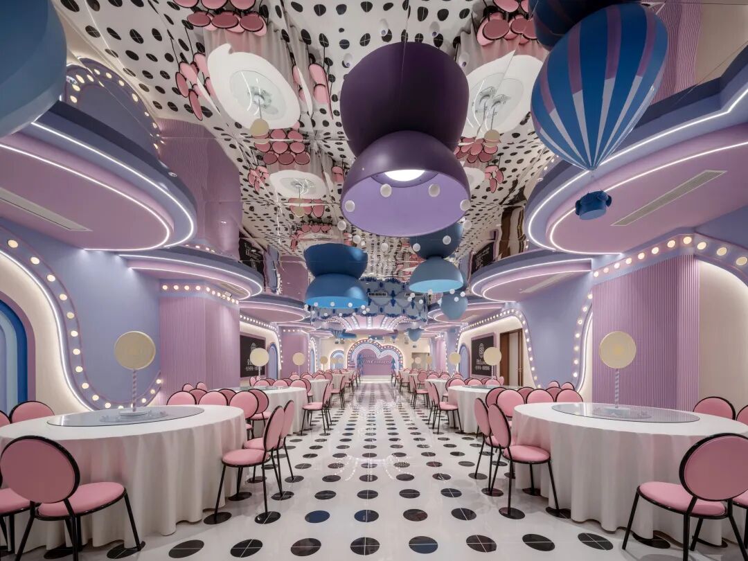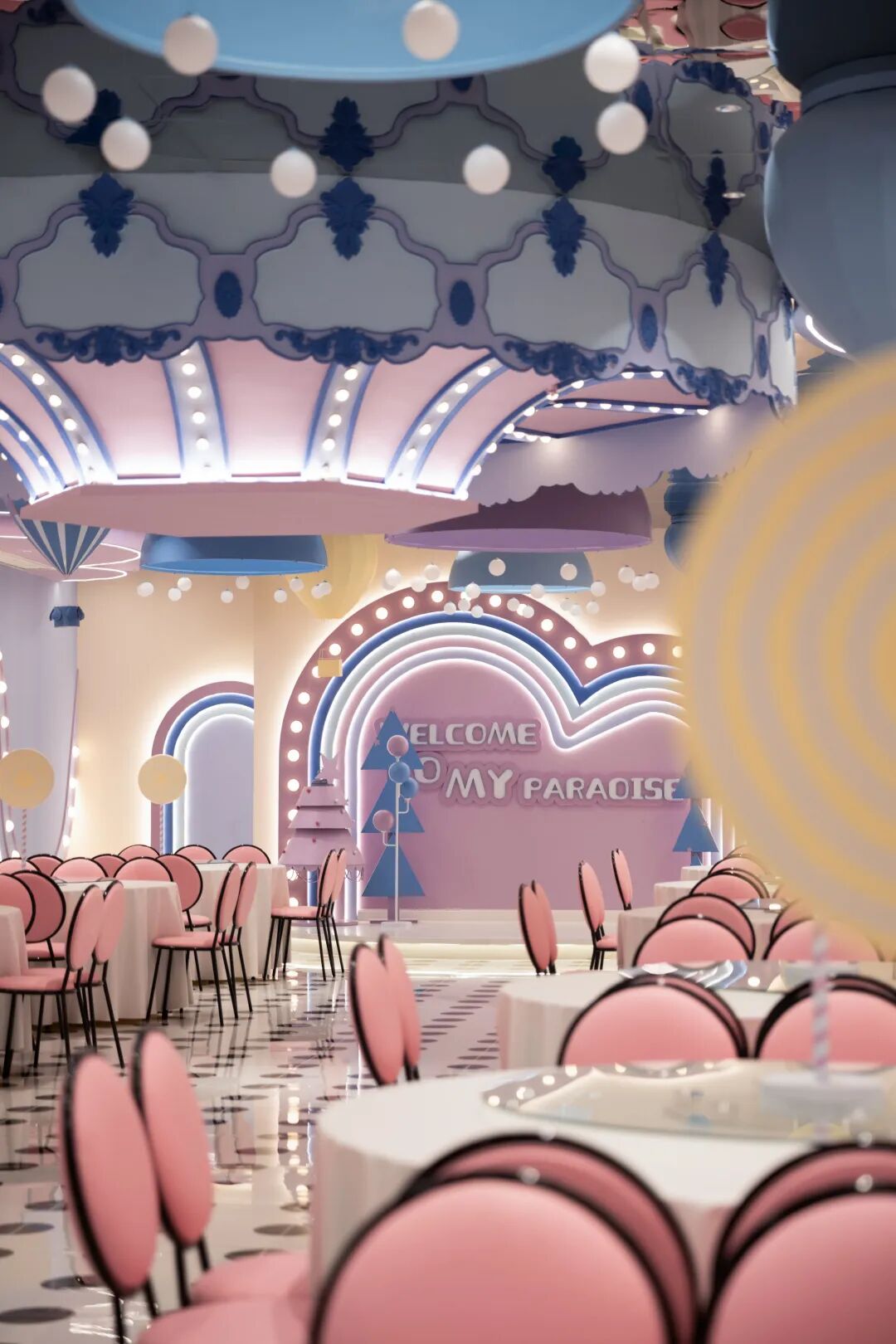 以一场蜃景为灵感的起点,琉璃般的蓝,在空间中晕染开一片悬浮的梦境。这并非遥不可及的海市蜃楼,而是一座可走入的浪漫幻城。踏过如浮于花海中的阶梯,光幕如潮汐般温柔退去。网格交织的穹顶之上,极光般的光色倏然绽放。