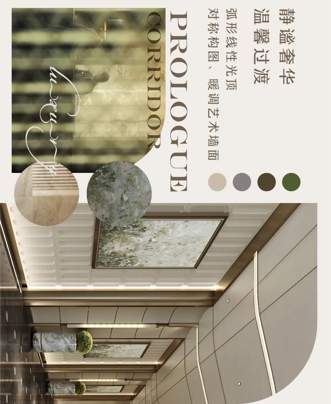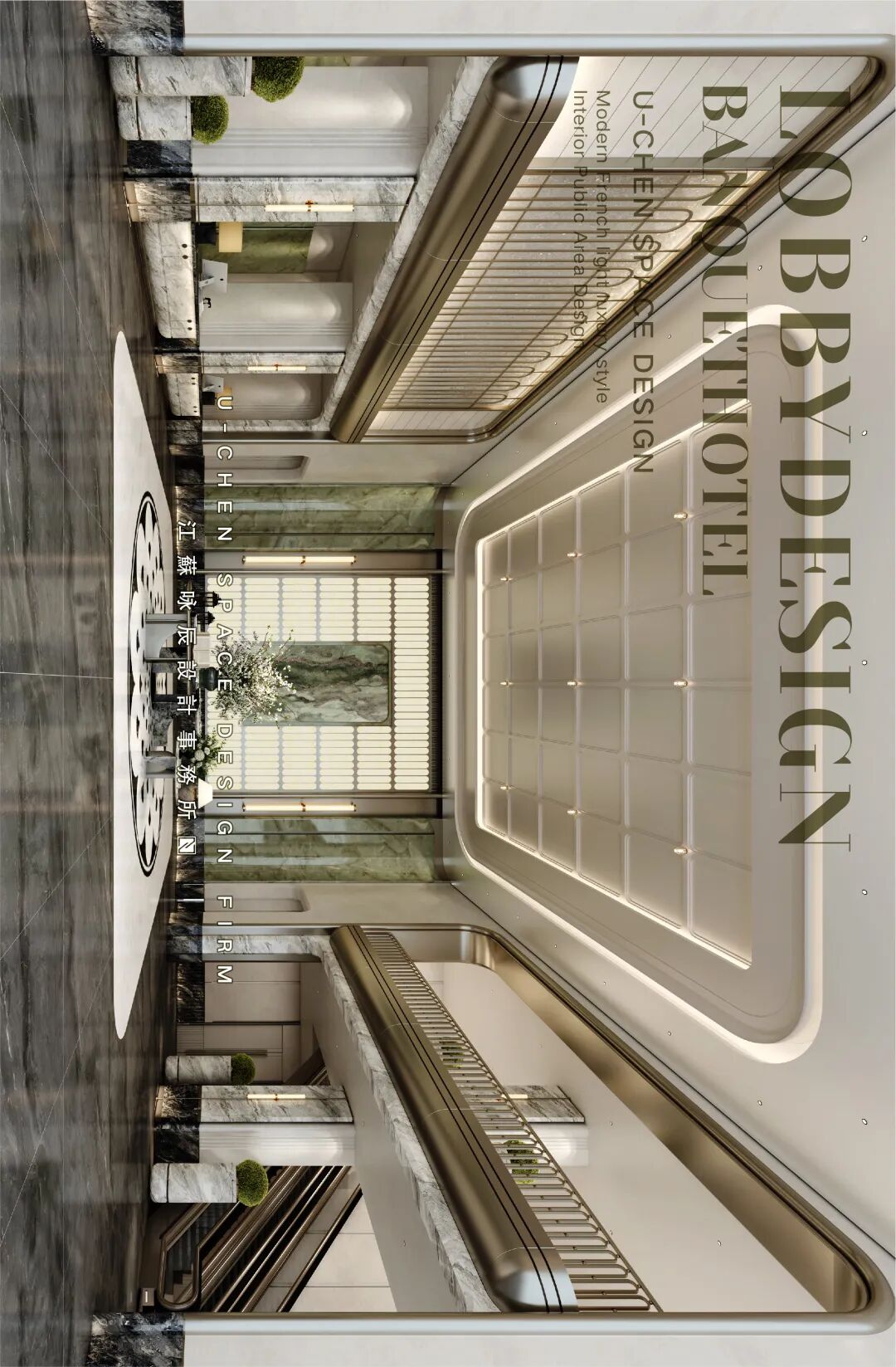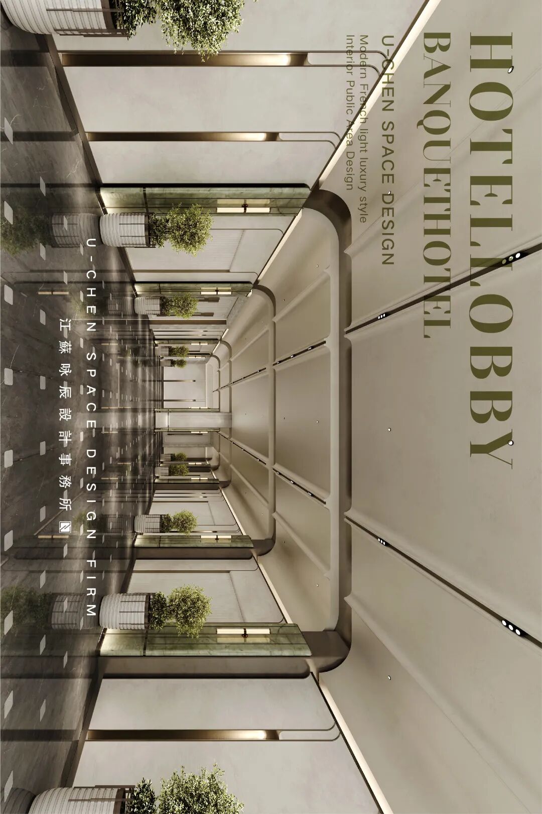 As the elegant beginning of the banquet experience, this prologue hall establishes the overall tone of the space with a modern French light luxury style. The symmetrical and rigorous layout highlights a sense of ceremony, with warm beige toned walls and dark gray flooring creating a soothing and sophisticated contrast. The smooth curved ceiling is embd a humanistic atmosphere, while the open top cabinet doors and hollow partitions ensure functionality while maintaining visual continuity and transparency. The green plants and marble flower bowls embellish the exquisite space, injecting natural vitality and creating a delicate, romantic, and artistic transitional space, quietly embarking on an unforgettable banquet journey.