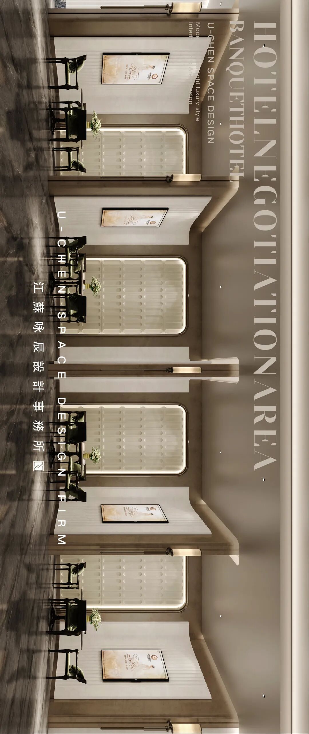 序厅作为宴会体验的优雅开端,以意式轻奢风格奠定了空间的整体基调。对称严谨的布局彰显仪式感,温暖的米咖色调墙面与深灰色地面形成舒缓而高级的对比。流畅的弧形吊顶嵌入柔和线性灯光,宛如一道光之穹廊,指引并迎接宾客。两侧艺术画作与壁灯点缀出人文气息,而通顶的柜门与镂空隔断在保障功能性的同时,保持了视觉的延续与通透。共同营造出一个精致、浪漫且充满艺术感的过渡空间,悄然开启一场难忘的宴会之旅。