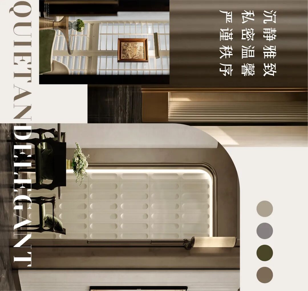 江蘇咏辰設計事務提炼出体块关系和清晰的线性语言为核心。挑高空间与对称布局奠定大气基调;大面竖条纹格栅墙与几何拼花地面强化纵向延伸感与现代秩序。材质上,温润青玉石材与冷峻金属形成质感对话,香槟金细节点缀于栏杆、收边等处,于简约中勾勒轻奢气质。整体摒弃繁复装饰,依靠比例、光影与材质对比,营造出兼具高端商务质感与现代意式艺术格调的静谧空间氛围。