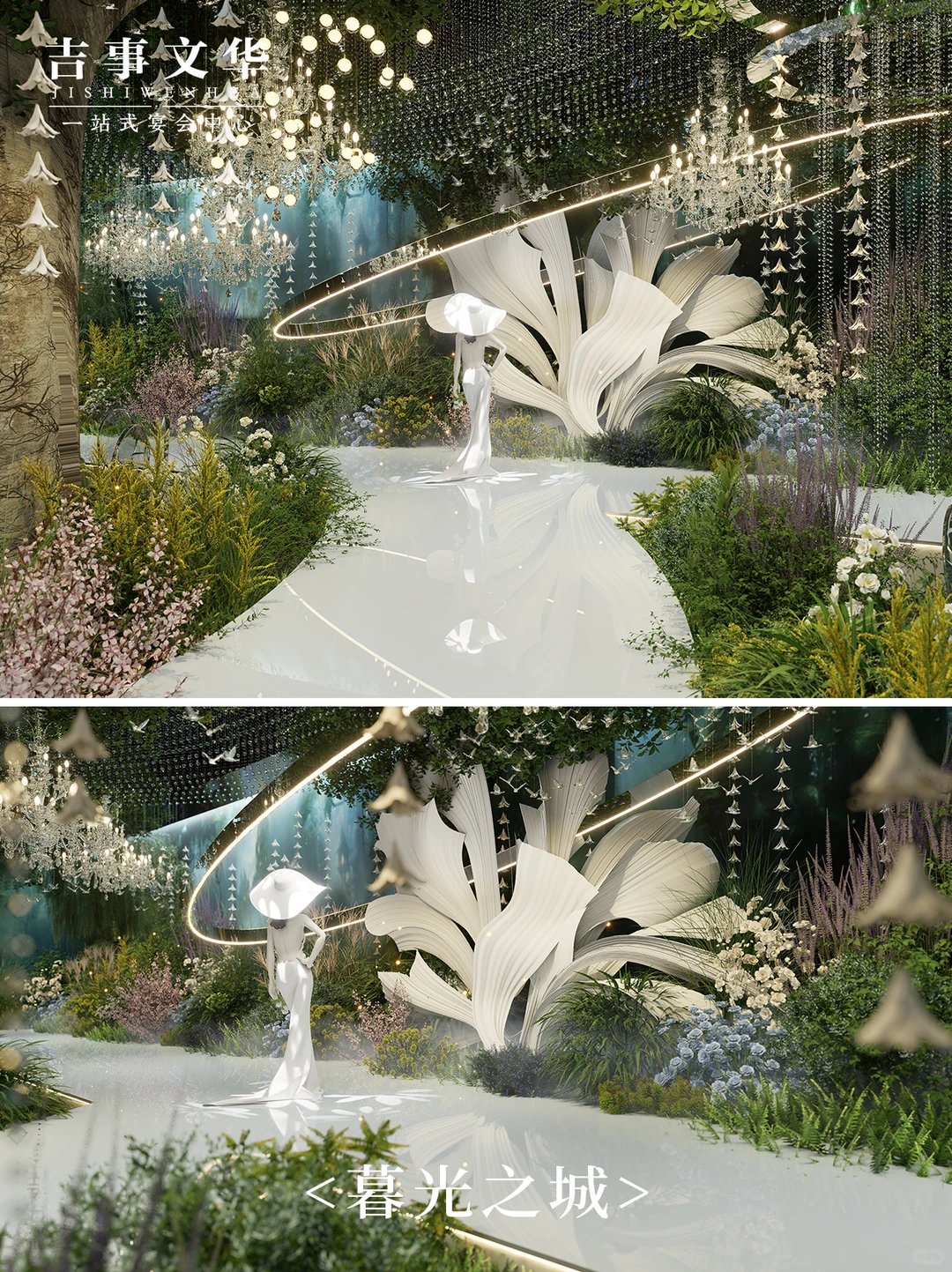 仿真古木错落林立,白绿花艺缠绕成自然花墙,隐藏光源模拟林间光斑,走进去像闯进雨后秘境。