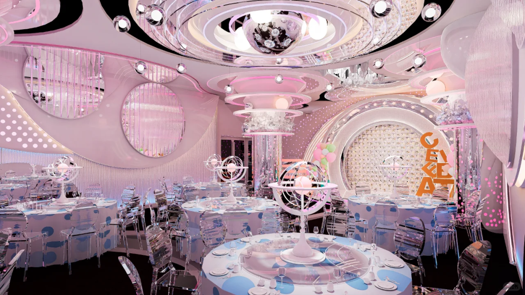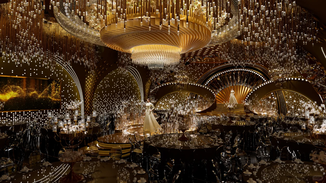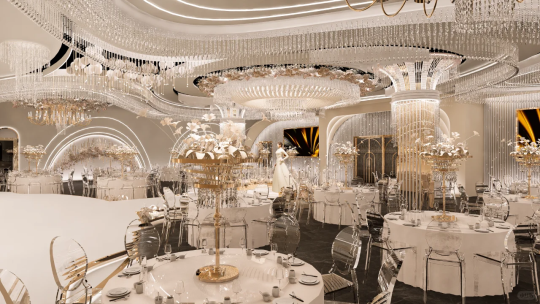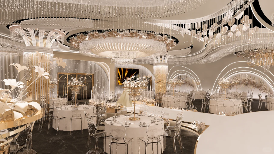 当你踏入厅内,成千上万颗悬挂的水晶珠串构成了如梦如幻的“星河”。在璀璨灯光的照耀下,水晶珠串折射出万千光芒,如同夜空中最亮的星辰,引领着每一位宾客缓缓进入一个充满梦幻色彩的世界。