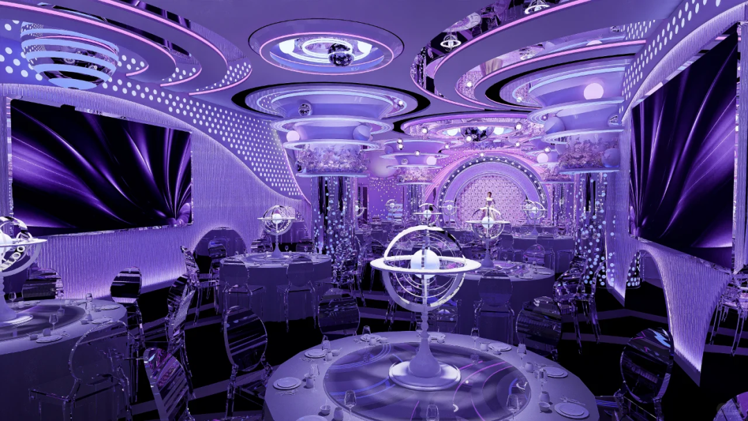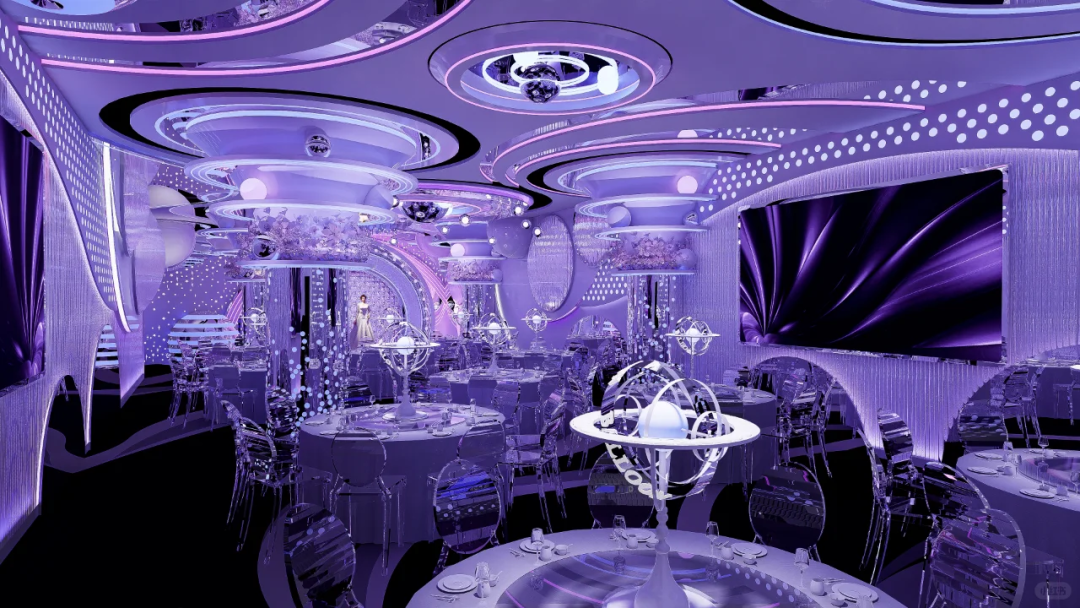 浩渺星河月色总是令人充满无尽的憧憬与梦想,我们以此为依托,打造一座以星河为核心概念的宴会空间,设计将一瞬的动感用规则的弧状曲线呈现,千百年来人类一直在观乎天文,以察时变的不断探索中,激发着对浩瀚宇宙的仰望。