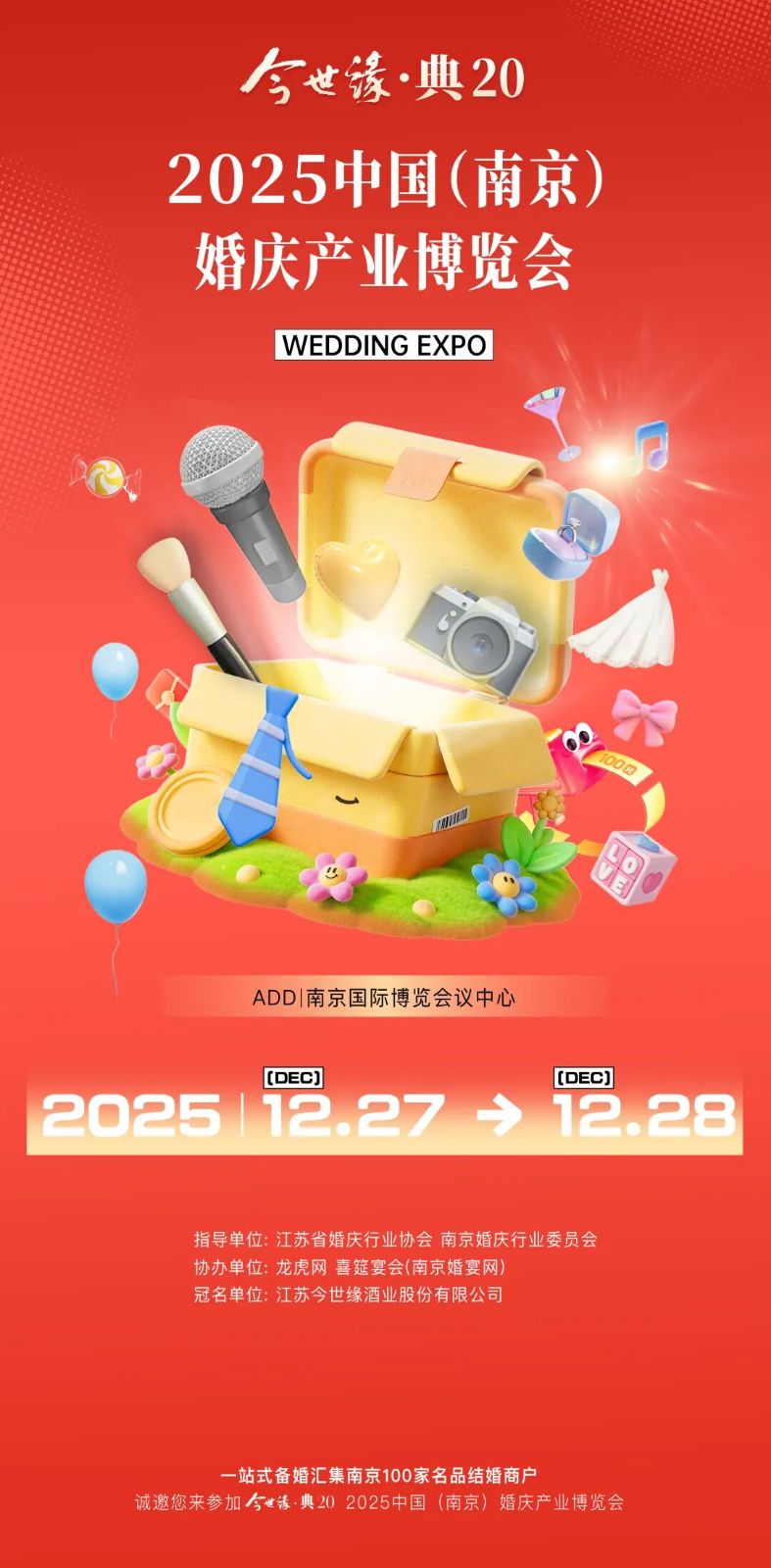 作为南京首届大型婚庆产业博览会,展会由江苏省婚庆行业协会、南京婚庆行业委员会担任指导单位,龙虎网、喜筵宴会(南京婚宴网)共同协办,旨在整合行业顶级婚庆资源,打造规格高、品牌全、体验优的标杆性婚庆平台。