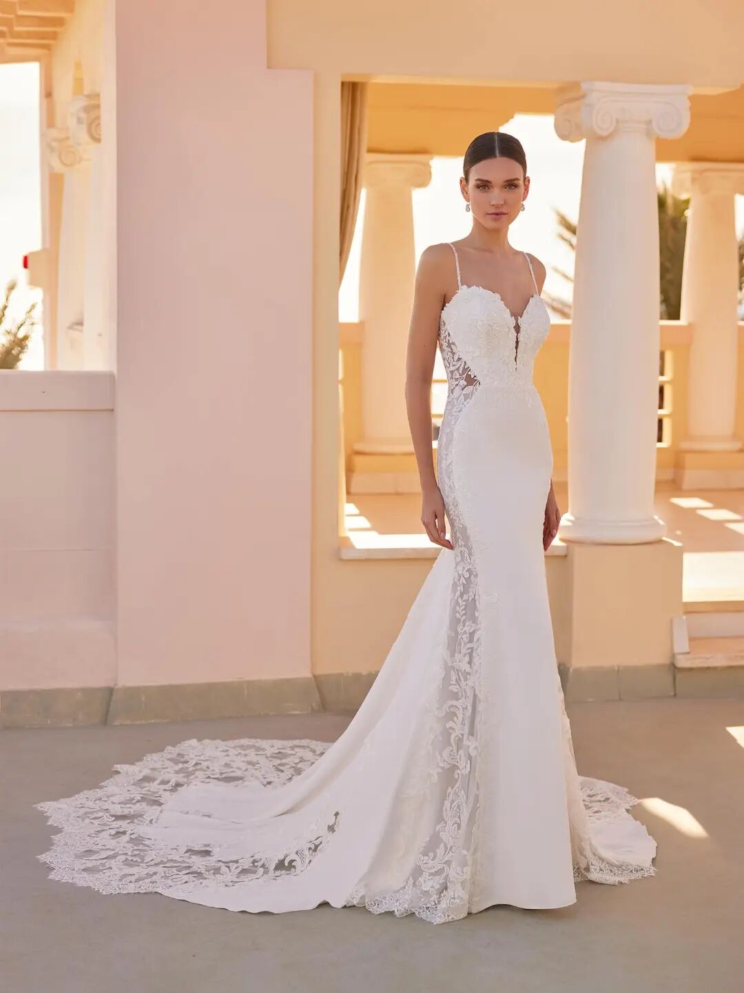 将婚纱礼服与精致的蕾丝元素融合,体现精致工艺美学。可以将同色半透网纱蕾丝与缎面材质拼接,呈现出闺房风的贵气雅致,也可以将蕾丝裁片贴在衣身或边处,更增法式浪漫风情。