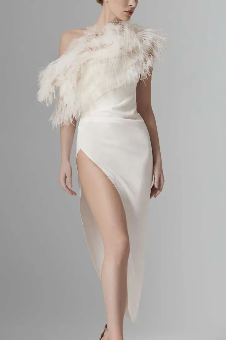 将柔软轻盈的羽毛元素巧妙地点缀于婚纱礼服的关键部位,如领边、腰部拼接处、下摆等。这种异质材料的组合,营造出蓬松飘逸的视觉效果,增添了整体造型的浪漫气质。