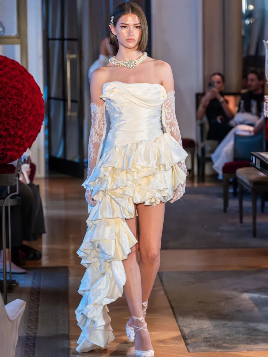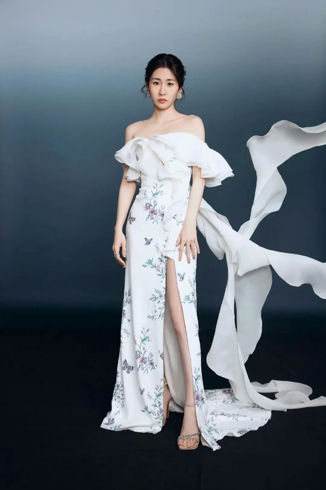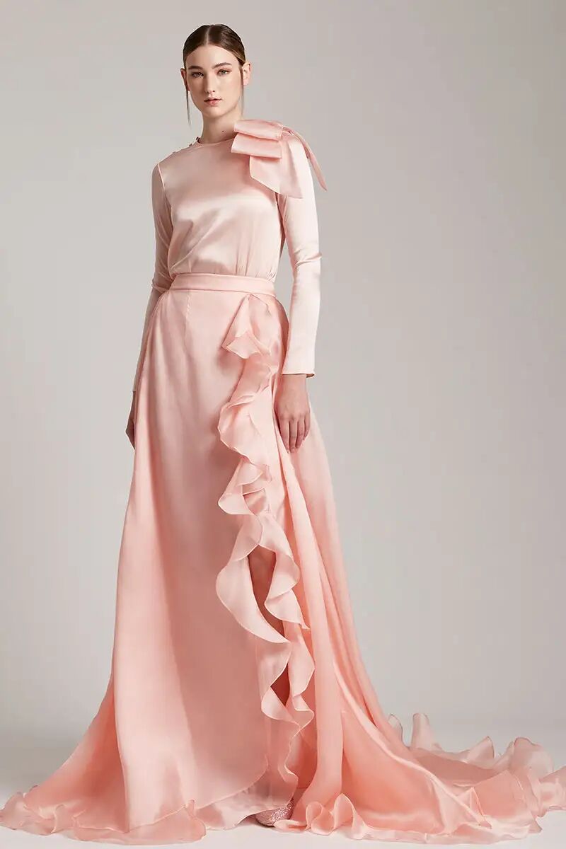 高开叉礼服裙设计露出部分腿部,方便行走。将开叉部分装饰荷叶边,提升了整体造型的优雅感的同时丰富了视觉效果。采用蕾丝或网纱缎面等不同材质的荷叶边,可营造出不同层次的浪漫风情。