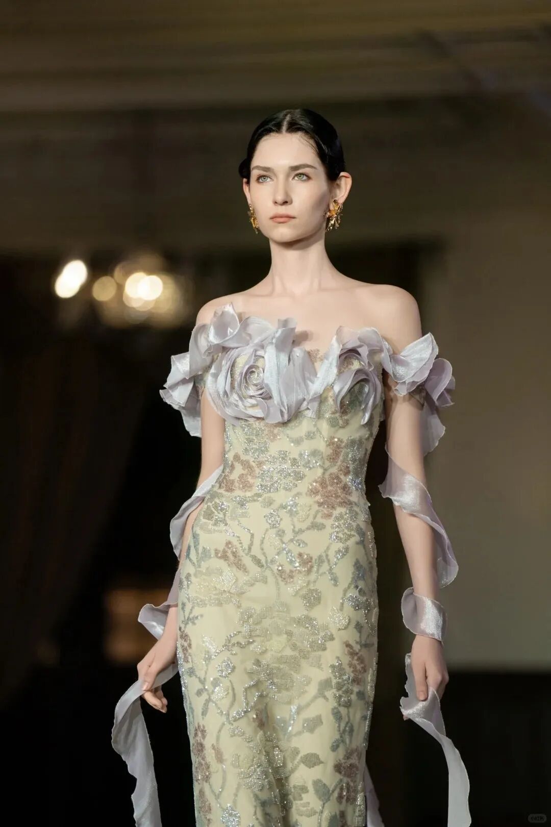 闪耀夺目的亮片元素巧妙运用于礼服之上,无论是采用渐变密集的排列方式,还是点缀于领围等醒目位置,都能为整体造型增添时尚摩登的视觉冲击力。