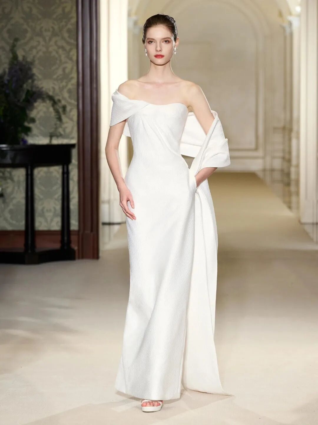 在侧肩围系披巾的设计常见于修身收腰款式的礼服裙上,既能营造浪漫飘逸的视觉效果,又能修饰肩部手臂的线条,更具灵活性。