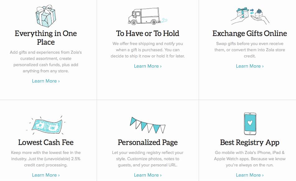 基本简介:是一个在线婚礼产品选购平台,主打结婚购物及礼物清单。用户可以自由组合不同的结婚物品、在线定制、直接上Zola购买或导购等。作为婚礼礼物选购网站,Zola凭借创新优势吸引了众多流量,抓住了这个市场。