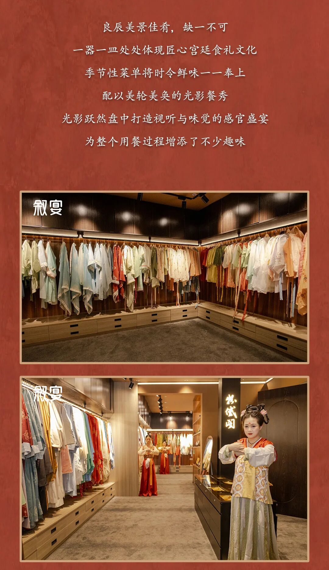 凤城御宴的2楼互动体验区,设有妆造司,上百套精美的汉服、妆造配饰,配有专业的化妆师,为用餐宾客进行一对一的妆造服务。