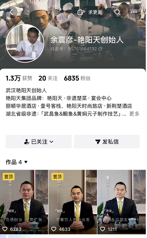 “大家好,我是艳阳天酒家的创始人余震彦。这是我第一次拍短视频,也是我这个70后的老武汉正式上场了,踏上了自媒体之路。”