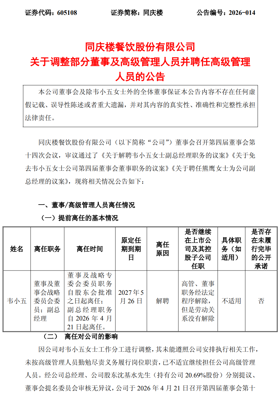 截至发稿,韦小五副总经理职务已被董事会解聘,但其劳动关系并未解除,董事职务仍保留,需等待股东会审议表决结果。董事会已选举熊鹰为新任副总经理,但同庆楼方面明确,熊鹰并非接替韦小五的婚礼宴会业务,“熊鹰主要负责公司拓展部,包括选址、开店等事项,与宴会板块不同,不负责经营。”公司表示,婚礼宴会板块“有相应人员承接,不会出现无人负责的情况”。