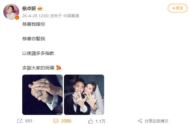知名歌手蔡卓妍官宣结婚!