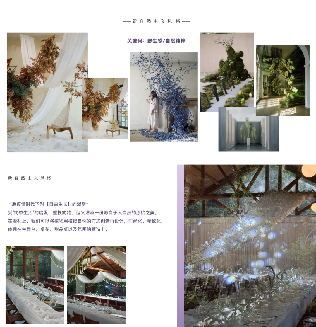 "后疫情时代下对【自由生长】的渴望",受简单生活的启发,重视简约,但又增添一份源自于大自然的原始之美。在婚礼上,我们可以将植物用模拟自然的方式创造再设计,时尚化、精致化,体现在主舞台、桌花、甜品桌以及氛围的营造上。