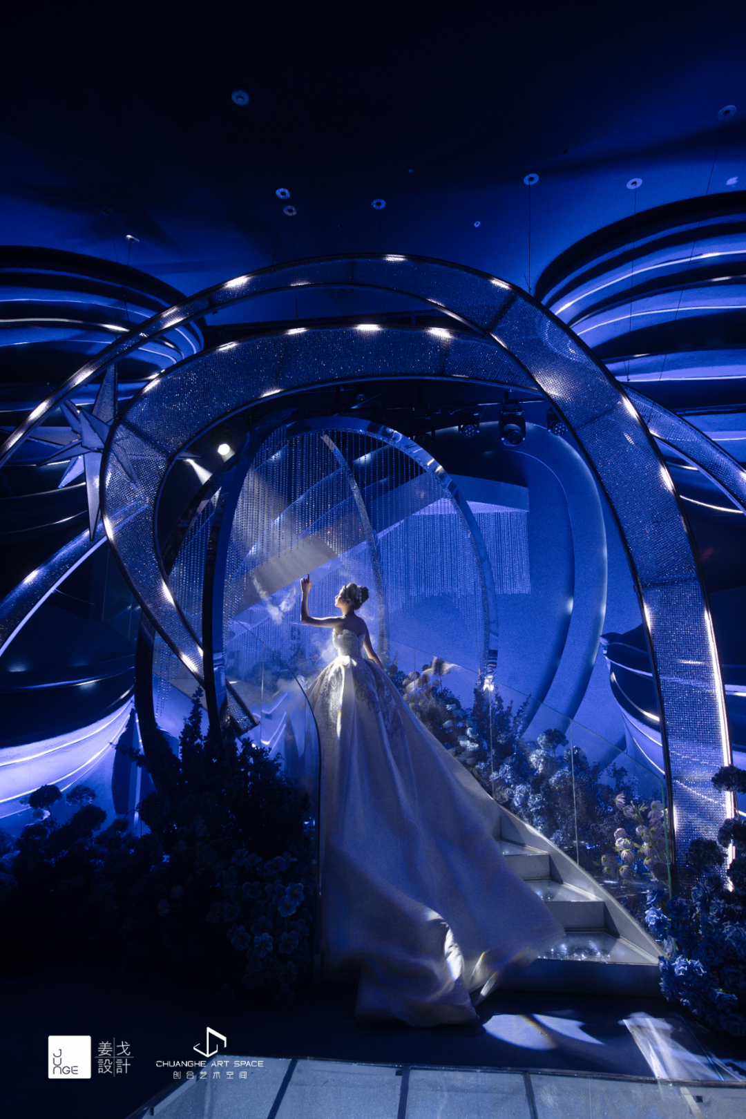 舞台是整个设计的视觉中心。玻璃楼梯盘旋而下,将整个空间联动起来,是整个设计的点睛之笔。当新人拾级而上,脚下数控星星灯明灭闪烁,垂挂的水晶链折射万千光辉,此刻,新人将携手在时间与光河中前行。