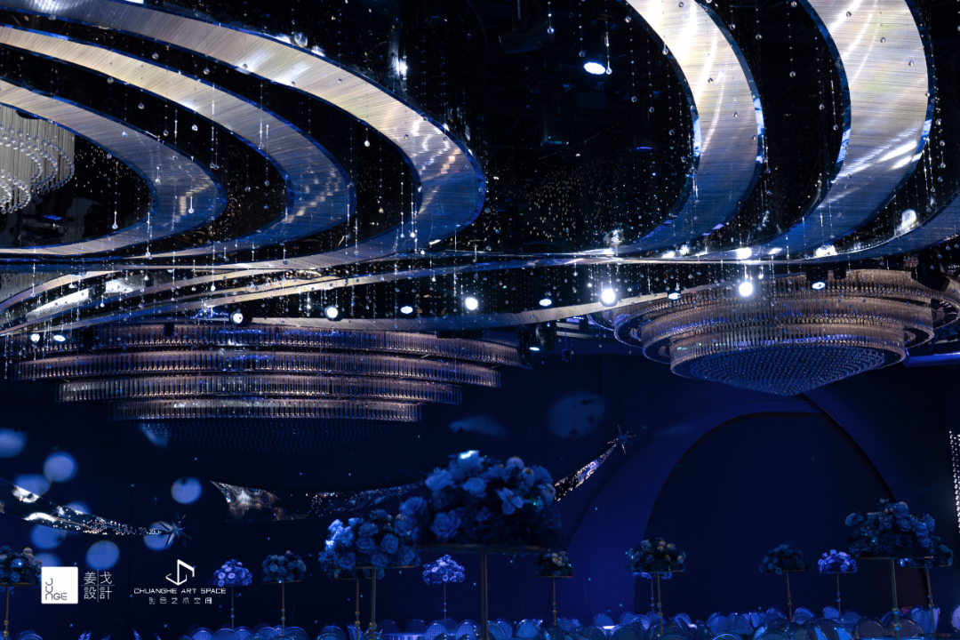 以“星海双生”为核心理念,打造了【寰宇星阶】星空厅与【潮汐回响】海洋厅。姜戈通过材质、光影与动线的精密编织,让空间本身成为情感的载体,从而达到“海天共鸣”的风格联动,演绎一场从浩瀚星辰到蔚蓝深海的沉浸式变换,象征着爱情既如星空般永恒,亦如海洋般深邃的双重特质。
