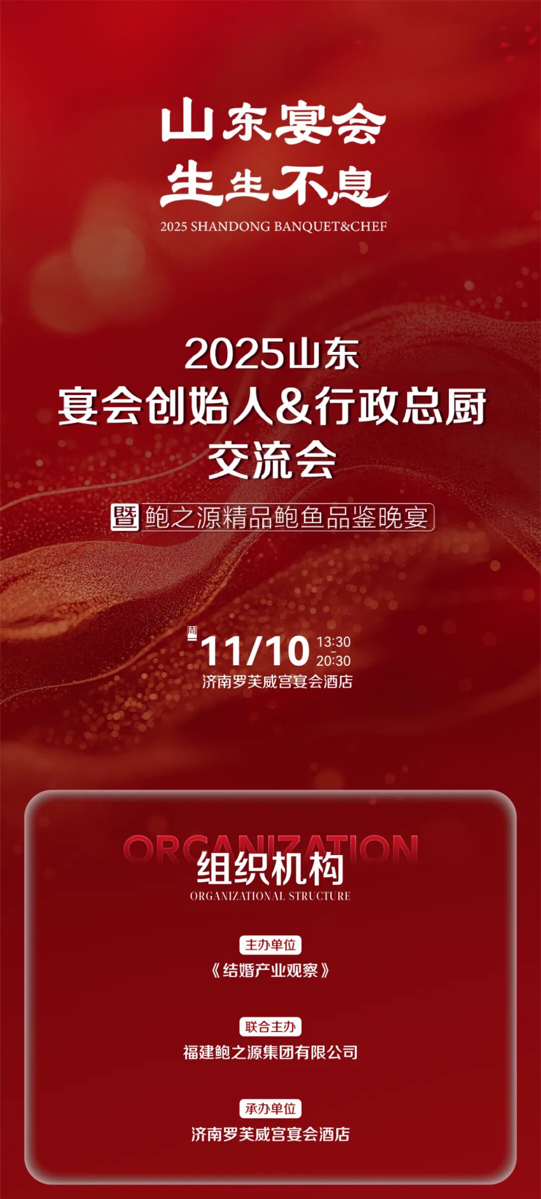 2025山东宴会创始人&行政总厨交流会,将于11月10日(周一 13:30-20:30),在济南罗芙威宫宴会酒店举办。