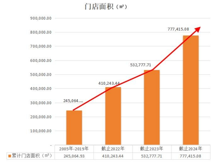 近几年来,公司门店面积快速增长:截至2019年12月31日,门店面积累计245,064.93平方米;2020年-2022年三年市场特殊情况中仍逆势而上,实际新增面积165,178.51平方米;2023年,公司新增门店面积122,534.27平方米;2024 年,公司新增门店面积244,637.37平方米,充分彰显了公司的经营韧性和发展能力。