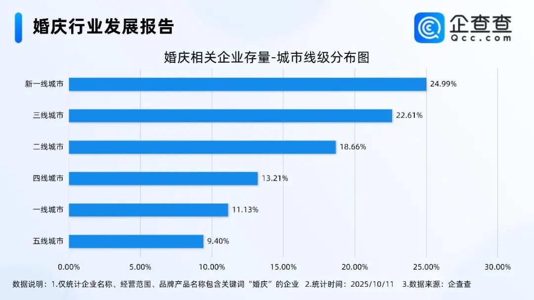 企查查显示,从城市线级分布来看,分布在新一线城市的婚庆相关企业最多,占比24.99%。其次,分布在三线城市、二线城市的相关企业分别占比22.61%、18.66%。