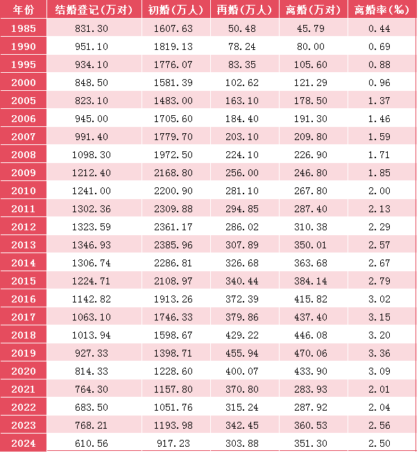国家统计局编著出版的《中国统计年鉴2025》显示,2024年全年全国结婚登记610.56万对。结婚数据包括初婚人数和再婚人数,其中,初婚人数与出生人口的关系更为密切。数据显示,去年我国初婚人数为917.23万人,再婚人数为303.88万人。