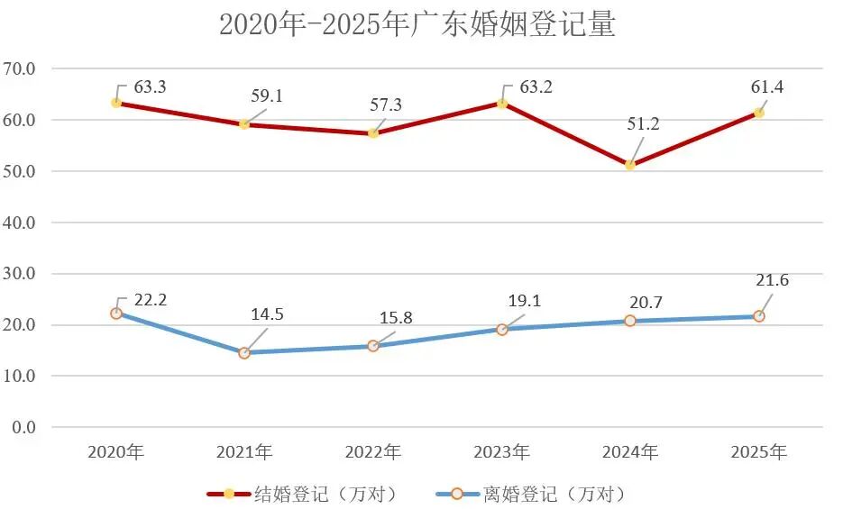 统计数据显示,2020年以来,广东每年结婚登记量均在50万对以上,其中,2020年、2023年、2025年超60万对。