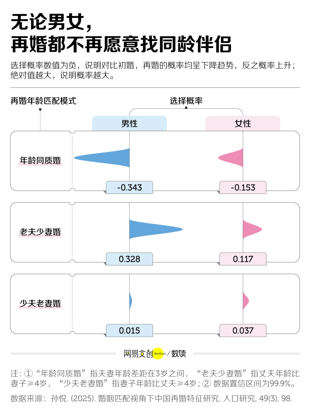 2025 年发表于《人口研究》的一项研究显示,再婚人群不愿再找同龄的伴侣,男性再婚更偏爱找比自己年纪小的,热衷“老夫少妻”的模式;女性再婚也同样喜欢找年轻的,比再婚男性更容易组成“少夫老妻”。