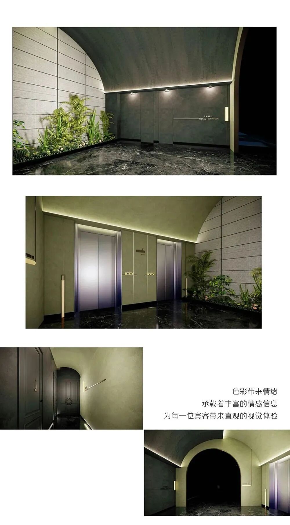 三楼公区设计用低调的灰色与白铺垫,跳脱的金色高光,搭配墨绿色大理石,就像翡翠项链,佩在白皙秀颀的颈部,凸显高级而独特的品味。