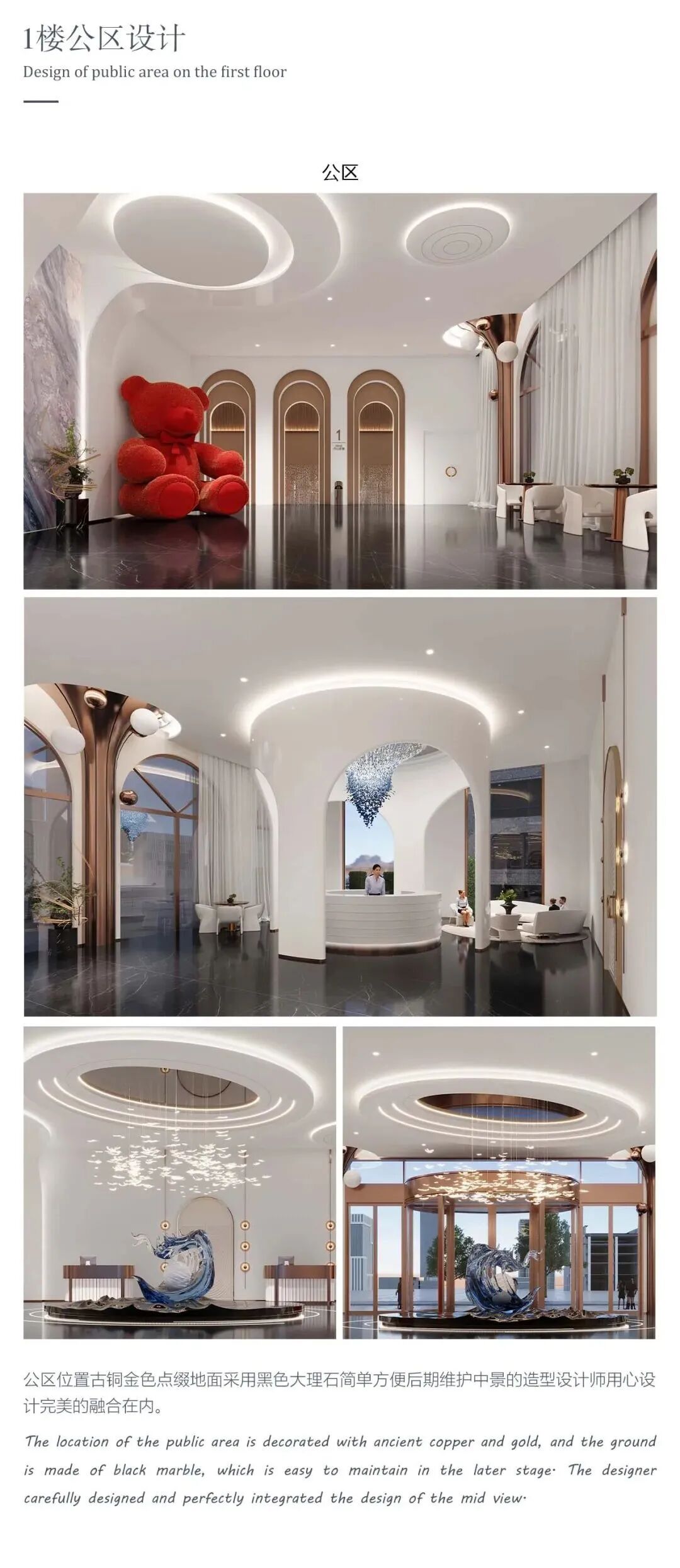 大堂的装饰设计别出心裁,巧妙地采用了烤漆处理的铝方通管。这些铝方通管犹如排列整齐的艺术线条,为整个大堂空间勾勒出独特而富有韵律的美感。水晶灯宛如繁星般璀璨矗立。采用了宛如白玉兰花般的形状,柔和而温暖的光芒透过水晶的折射,洒在地面的大理石上,形成一片片迷离的光影。地面铺设的大理石,纹理如花瓣般自然舒展,与白玉兰花瓣形状相互呼应,仿佛是大地绽放的花朵。右侧是网红楼梯打卡点,踏上这段独特的楼梯,仿佛走进了一个音乐的奇幻世界。每走一步,都如同按下了一个隐形的琴键,清脆悦耳的声音随之响起。步入一楼工区,瞬间被那以白金色为主色调的空间所吸引。地面上灰色大理石花纹如同一幅自然天成的水墨画,细腻的纹理交织出神秘而深邃的图案。整体色彩的搭配,让人看起来无比简约却又极致高级。前台采用半圆曲线形设计,宛如一弯优雅的新月。抬头望去,天花板同样采用了曲线形设计,仿佛是一片轻盈的云朵。金色边的镶嵌,犹如璀璨的星辰点缀在天空之中,显得格外耀眼夺目。天花板的弧形装饰巧妙的与楼梯连接在一起,形成了一个和谐统一的整体。从天花板到楼梯,金色的线条如一条闪耀的纽带,引领着人们的视线。每一处转角,每一个细节,都透露着设计师的精心考量和对完美的不懈追求。