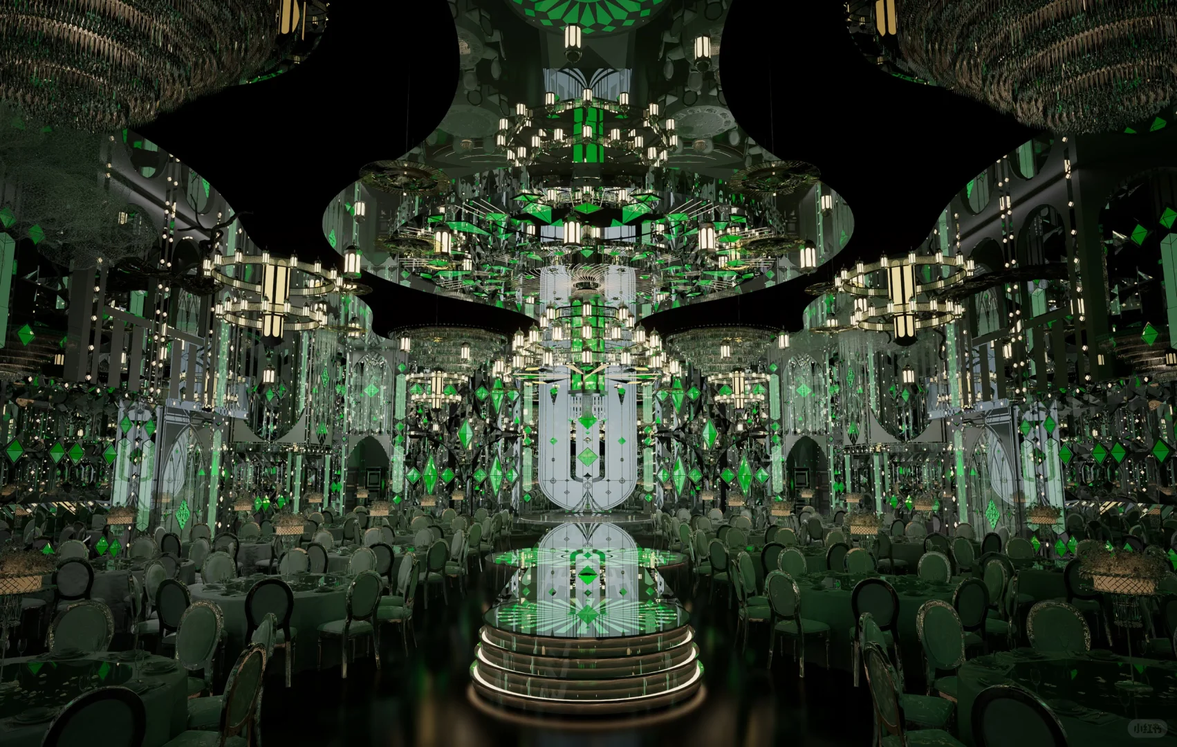 高级轻奢的绿色花艺沿着舞台两侧错落摆放