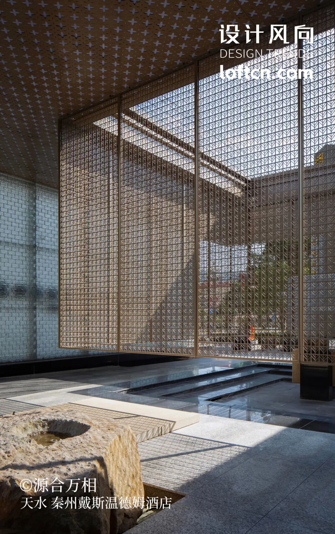 香槟金色的金属格栅从上方垂下,由古典窗花演绎而成的纹样宛如一层轻柔的帘幕包裹着中央的水景与石台,简单的几何块面延伸出空间的庄重感。而透过这隔而不断的帘幕,朦胧中可见远处的天光和影影绰绰的树木,空间的纵深在这一刻被放大到极致,丰盈的层次感给予了空间无限的意境。