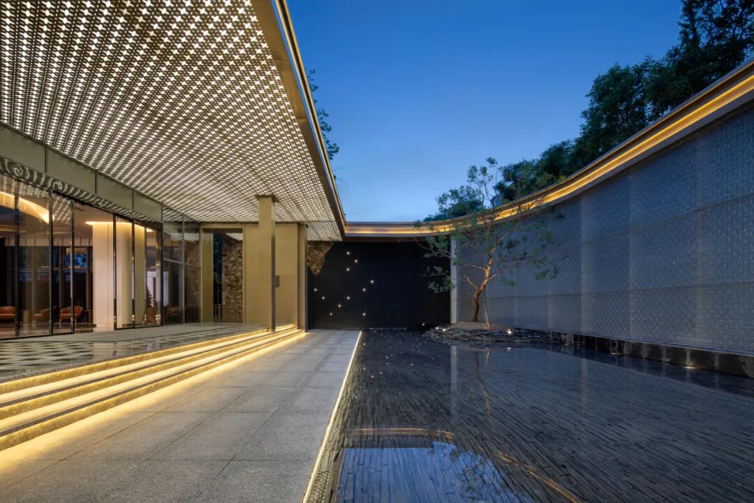 傍晚,暮色中光影的边界渐渐模糊,酒店明亮的灯光照亮着旅客的归途,玻璃砖逐渐晶莹剔透起来,而门前的一池浅水下缀着点点星光,正与城市的晚霞相得益彰。层层叠叠的幕帘时隔时透,檐下镂空的纹样镌刻出细腻的光幕,用光与影的粒子化语言,将酒店前场这一本易被忽视的过渡区域,转换为了华丽璀璨的场所记忆点。