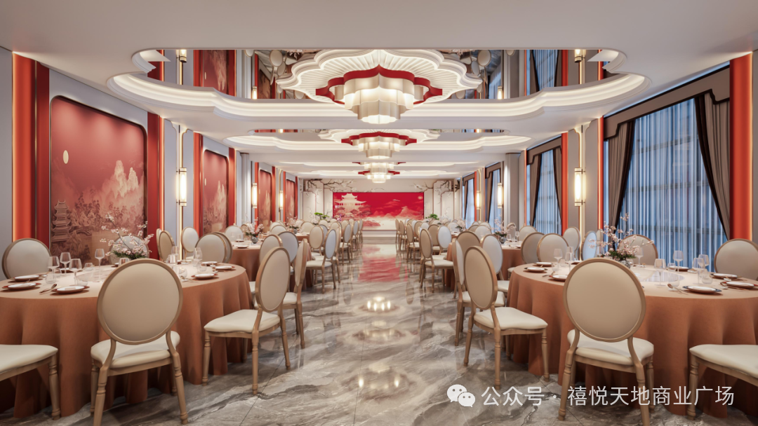 禧悦天地国际宴会中心,5000㎡、9大主题宴会厅,位于商场内部4楼,可满足各类宴席需求。